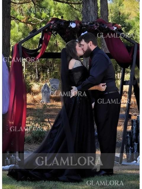 This A-line wedding dress features an off-the-shoulder neckline and short sleeves adorned with delicate lace appliqu