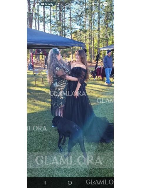 Warning: Undefined property: Product::$size_chart in /data1/www/glamlora-com.myamz2022.com/htdocs/controllers/front/ProductController.php on line 1062 A-line Elegant Off-the-Shoulder Short Sleeves Sweep Train Tulle Wedding Dress With Appliques Lace - Glamlora