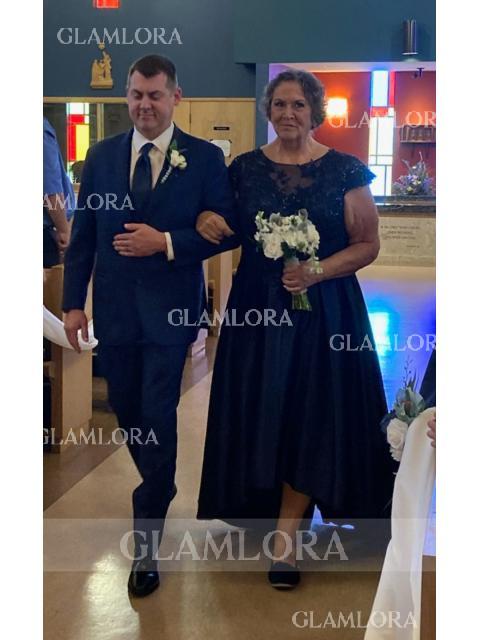 This mother of the bride dress is styled in an A-line silhouette with a bateau neckline, short sleeves, applique detailing, and an asymmetrical hemline. Crafted from satin, the dress offers a chic and modern look for the mother of the bride.