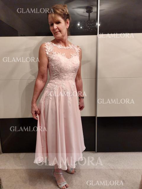 • A-Line Modest Scoop Chiffon Tea-Length Mother of the Bride Dress With Appliques Lace