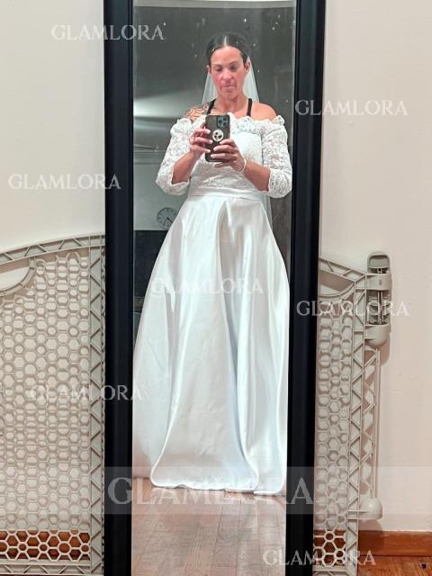 • Ball Gown Off-the-Shoulder 3/4 Sleeves Sweep Train Satin Chic Wedding Dress With Lace