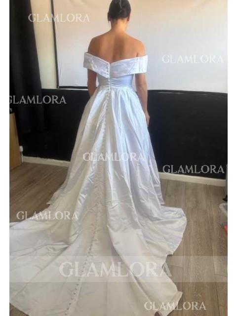 A-line Pretty Off-the-Shoulder Sleeveless Chapel Train Satin Wedding Dress - Glamlora