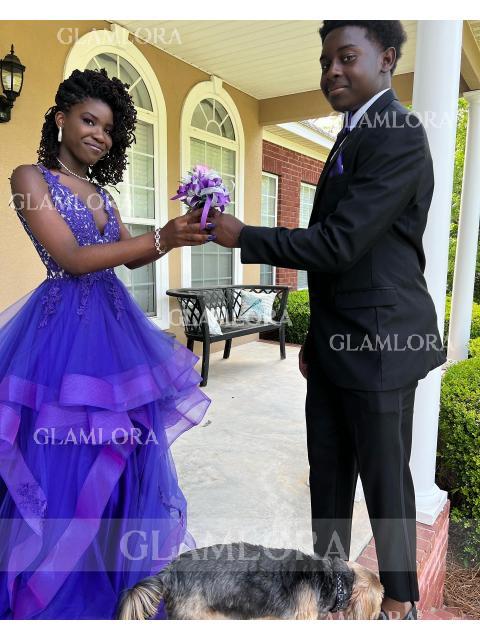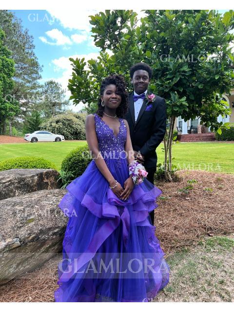 • A-line Princess Classic V-Neck Sleeveless Floor-Length Tulle Corset Prom Dress With Sequins