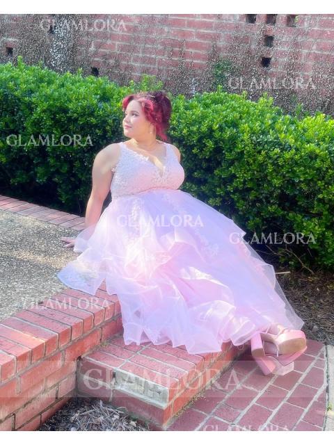 A-line Princess Classic V-Neck Sleeveless Floor-Length Tulle Corset Prom Dress With Sequins #GLWH0051
