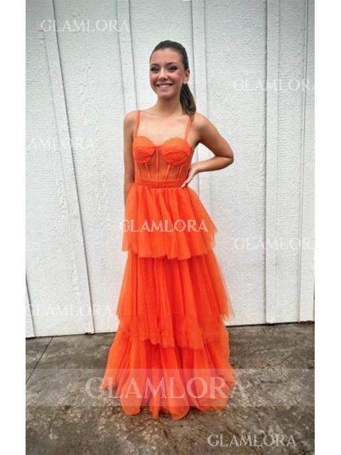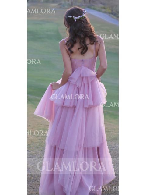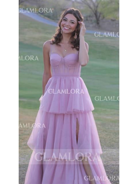 • A-line Spaghetti Straps Sweep Train Tulle Corset Prom Dress