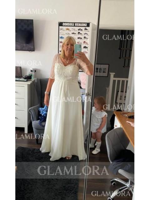 • A-line V-Neck 1/2 Sleeves Floor-Length Timeless Chiffon Mother of the Bride Dress With Beading