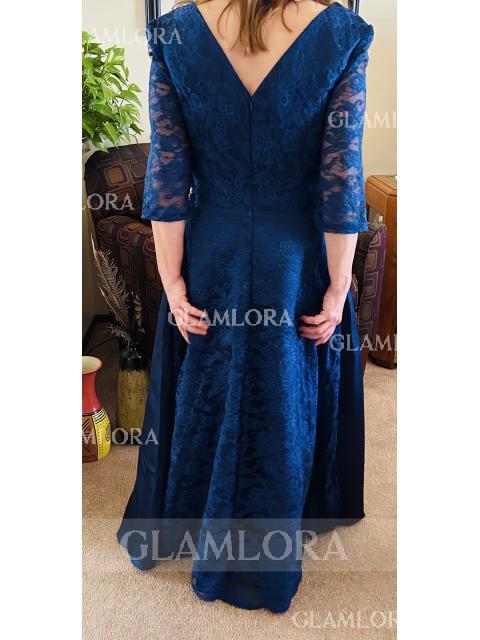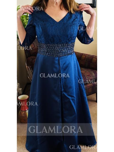 • A-line V-Neck 3/4 Sleeves Floor-Length Satin Regal Mother of the Bride Dress With Beading