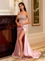 • Aristocratic Sheath Straight Rhinestone Sweep Train Silk Like Satin Corset Prom Dress
