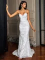 V-neck, sleeveless sheath wedding dress with lace appliques and a court train in lace fabric.