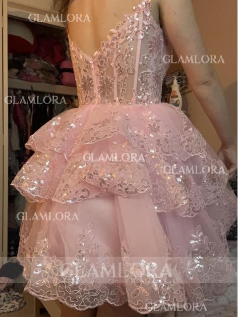 A sleeveless ball gown dress with a V-neckline, adorned with appliques lace. The dress is made from tulle fabric and features a corset-style bodice. It falls at a short/mini length.