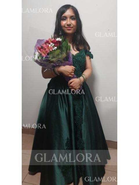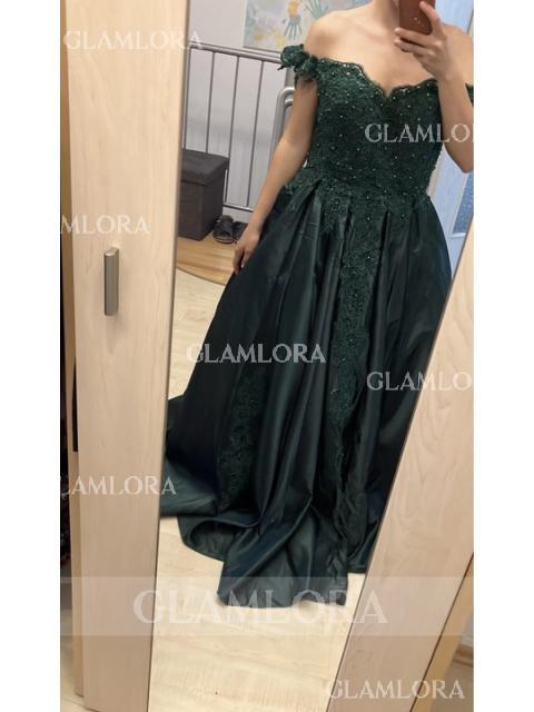 • Ball-Gown Gorgeous Off-the-Shoulder Sleeveless Floor-Length Satin Prom Dress With Lace