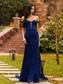 An elegant sheath prom dress featuring an off-the-shoulder, sleeveless design adorned with delicate lace appliques. Flowing into a graceful sweep train, it creates a sophisticated and timeless silhouette perfect for formal events and special occasions.