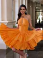 The Glamorous mini taffeta corset dress crafted from high-density taffeta, the sleek, sleeveless, halter neck design provides firm support and enhances the shoulder line. The hollow back straps adjust the waist, while the hidden herringbone design maintains shape. The ruffles are fluffy and stretchy, while the skirt is built with organza to create a sculpted look. The bodice is embellished with sparkling rhinestones for a captivating touch and lasts for everyday wear.