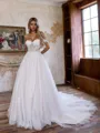 This enchanting A-line wedding dress features an off-the-shoulder neckline that beautifully highlights the collarbones and shoulders. Crafted from delicate tulle, the bodice is adorned with intricate lace appliques that add romantic texture and elegance. The sleeveless design keeps the look light and graceful, while the structured corset waist flatters the figure. A flowing cathedral-length train completes the ensemble, perfect for a fairy-tale wedding day.