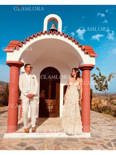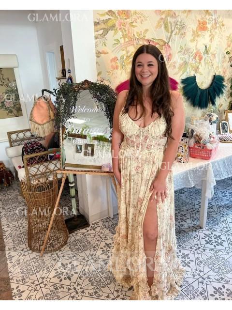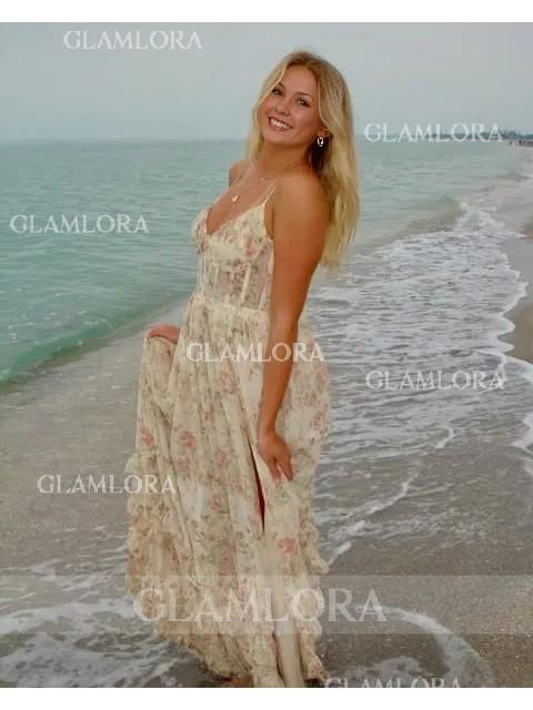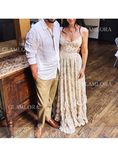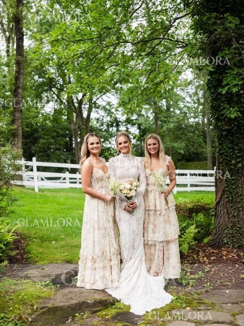 A stunning A-line bridesmaid dress with a V-neck and sleeveless design. The dress features beautiful ruffles that add texture and movement, creating a soft and romantic look. Its floor-length silhouette enhances the elegant style, while the corset back provides a customizable fit, offering both comfort and a flattering shape. Perfect for a timeless and feminine wedding ensemble.