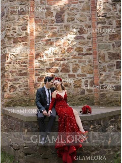 A form-fitting sheath dress with a V-neckline, a sleeveless design, and adorned with luxurious velvet and shimmering sequins. It features a sweeping train for added elegance.