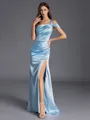 A sleek and elegant sheath bridesmaid dress featuring a one-shoulder design, sleeveless style, and pleated details. Made from silk like satin, this floor-length dress offers a flattering fit and graceful movement, perfect for any formal occasion.
