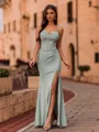 A long, sleeveless sheath dress with spaghetti straps, pleated detailing, and a floor-length hem. It features a corset for a tailored fit.