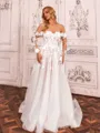 This elegant A-line wedding dress features a romantic off-the-shoulder neckline and long sleeves adorned with delicate lace appliques. Crafted from soft tulle, it is designed with a structured corset bodice for a flattering fit and flows into a graceful court train, combining timeless sophistication with refined, feminine elegance for the special day.