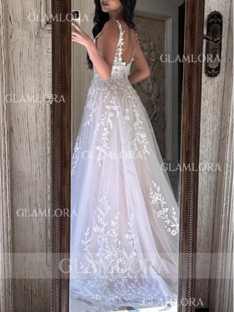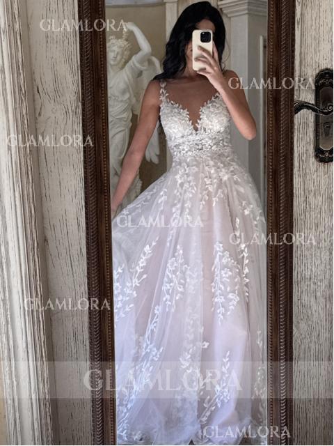 Tips:Whatever color option you choose, only the lining color will change, the outer lace is ivory. Whatever color option you choose, only the lining color will change, the outer lace is ivory. Exude timeless romance in this A-line wedding dress, featuring a flattering scoop neckline and sleeveless design adorned with intricate lace appliques. Crafted from airy tulle, it cascades gracefully to the floor with a sweeping train. Perfect for the bride seeking classic beauty and elegance with a touch of whimsical charm on her special day.
