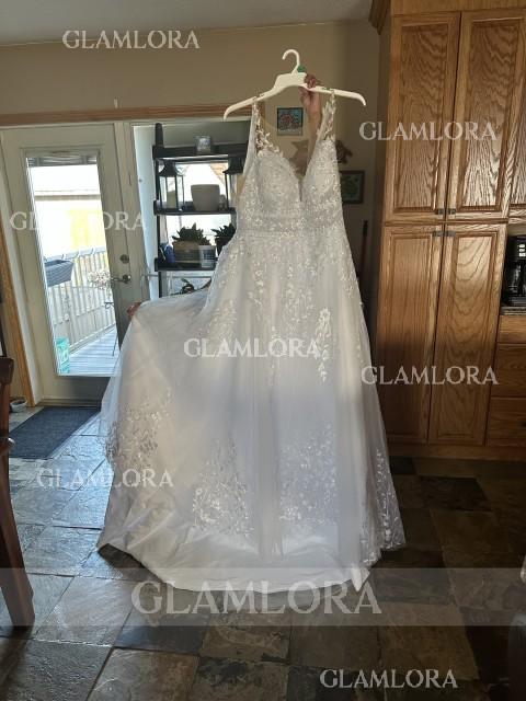 • Charming A-line Scoop Appliques Lace Sweep Train Tulle Wedding Dress