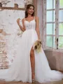 Elegant A-line wedding dress featuring spaghetti straps, a sleeveless design, and delicate lace appliques. The gown is adorned with a chapel train crafted from graceful tulle, and the corset detail adds a touch of sophistication to create a timeless and romantic bridal ensemble.