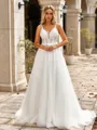 • Charming A-line V-Neck Appliques Lace Sweep Train Tulle Wedding Dress