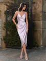 • Charming Sheath Spaghetti Straps Pleated Tea-Length Silk Like Satin Bridesmaid Dress