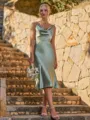 A stylish sheath bridesmaid dress featuring spaghetti straps and a sleeveless design, accented with a sash ribbon belt at the waist. Made from silk-like satin, it falls to a tea-length hem, creating an elegant and flattering silhouette perfect for weddings and special occasions.