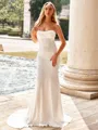 Drape yourself in elegance with this sheath wedding dress, boasting a sweetheart neckline, sleeveless design, and graceful pleats. Crafted from luxurious charmeuse fabric, it features a sweeping train that adds a touch of sophistication. The corset bodice ensures a flattering fit, perfect for a bride seeking timeless beauty and allure on her special day.