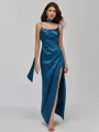 This sleek sheath dress features delicate spaghetti straps and a sleeveless design. The pleated detailing adds texture, while the floor-length silk-like satin fabric drapes elegantly for a sophisticated finish.