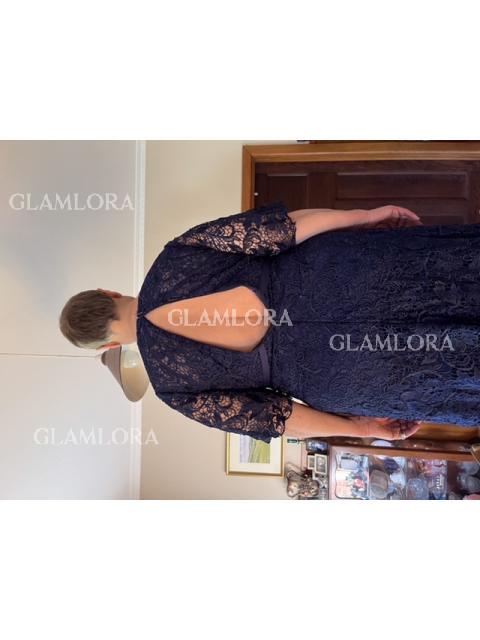 This asymmetrical lace mother of the bride dress features an A-line silhouette, offering a timeless and flattering look. The scoop neckline and half sleeves add a touch of elegance and sophistication. Delicate lace detailing enhances the bodice, providing a romantic and feminine touch to the ensemble. Perfect for a mother who desires a chic and graceful appearance for her daughter's wedding.