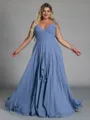 This A-line bridesmaid dress features a flattering V-neckline and sleeveless design. Made from soft chiffon, it's adorned with delicate ruffles that add movement and feminine charm. The corset bodice shapes the waist, while the floor-length skirt creates an elegant and graceful silhouette-perfect for plus size bridal parties.