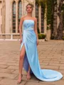 A classy sheath prom dress crafted from luxurious charmeuse, featuring elegant pleated detailing and a timeless strapless neckline. The sleeveless design enhances its sleek silhouette, while the sweep-train hem adds a touch of drama and grace perfect for making a stylish and unforgettable entrance.