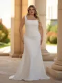 This plus size sheath wedding dress features a chic square neckline and sleeveless design, crafted from stretch crepe for a comfortable fit. The fitted silhouette flows into a graceful sweep train, creating a modern and elegant bridal look.