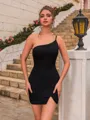 A classy sheath homecoming dress crafted from smooth stretch crepe, featuring a sleek one-shoulder neckline for a modern, chic touch. The sleeveless design and short/mini hem create a stylish, playful silhouette perfect for making a bold, yet elegant entrance at any event.