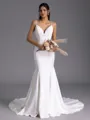 The Sheath V-neck Sleeveless Bow Chapel Train Wedding Dress in Stretch Crepe is a stunning and sophisticated choice for brides. With its sleek sheath silhouette, elegant V-neckline, and sleeveless design, this dress exudes timeless charm and modern elegance. The addition of a bow detail adds a touch of romance and femininity. Crafted from stretch crepe fabric, it offers a comfortable fit with a sleek and tailored look. Perfect for weddings or special occasions, this dress ensures the bride makes a memorable statement while feeling confident and glamorous throughout the celebration.