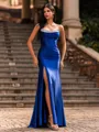 A stunning sheath prom dress featuring a straight, sleeveless neckline adorned with sparkling rhinestones. Flowing into a graceful sweep train, it creates an elegant and sophisticated silhouette perfect for formal events and special occasions.