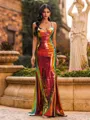 An elegant sheath prom dress featuring a V-neckline and sleeveless design. Flowing into a graceful sweep train, it creates a sophisticated and timeless silhouette perfect for formal events and special occasions.