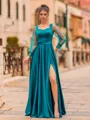 A delicate A-line prom dress crafted from smooth, lustrous charmeuse, featuring soft ruffle details and a classic square neckline. The long sleeves add an elegant touch, while the floor-length silhouette creates a refined, graceful look perfect for making a stylish entrance.