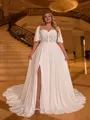 This plus size A-line wedding dress features a classic scoop neckline with short sleeves, adorned with delicate lace appliques. The soft tulle skirt flows into a graceful chapel train, while the A-line silhouette flatters every figure, creating a romantic and timeless bridal look.