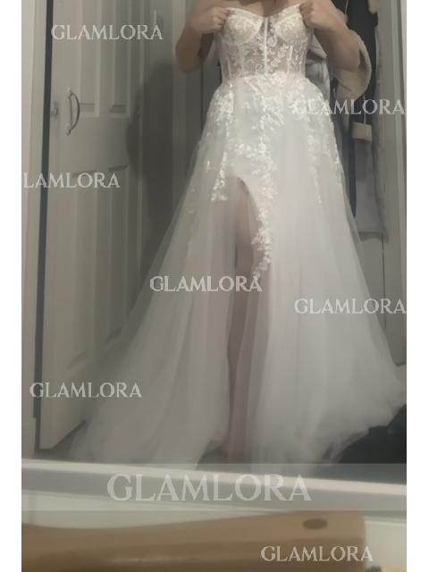 1. This A-line wedding dress showcases a sweetheart neckline and sleeveless design adorned with delicate lace applique.