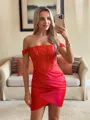 Elegant sheath charmeuse dress with off-the-shoulder neckline, corset bodice, and pleated details, offering a captivating short/mini look.