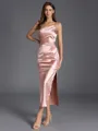 A sheath one-shoulder sleeveless bridesmaid dress made from pleated, silk like satin fabric. The tea-length design provides a chic, sophisticated look, ideal for a stylish and elegant wedding celebration.