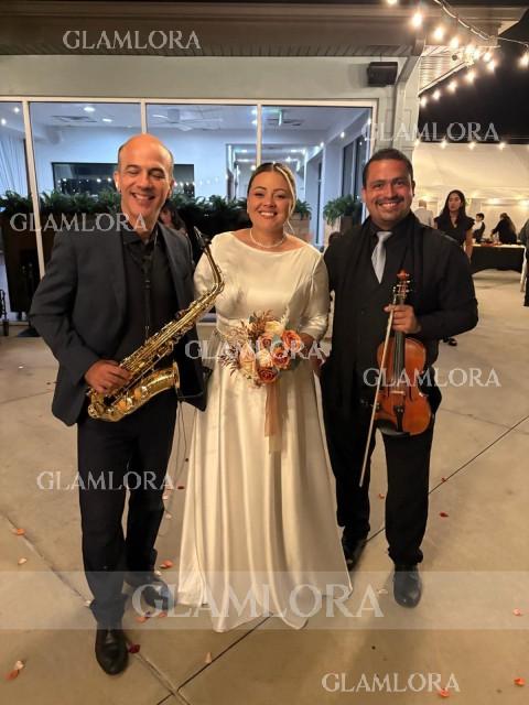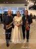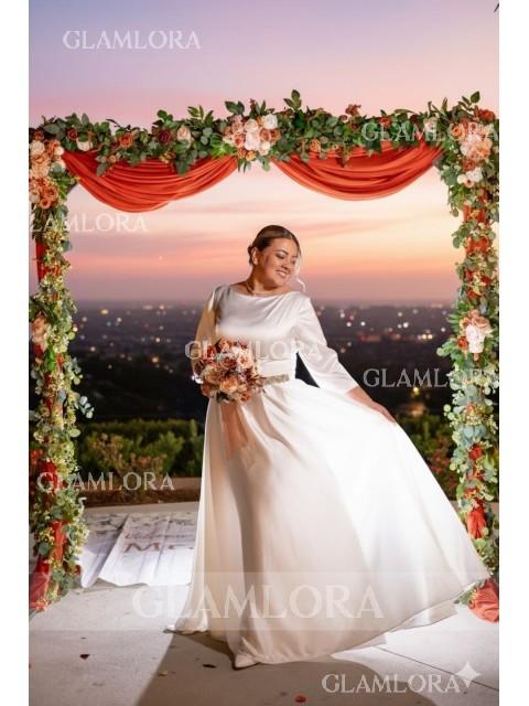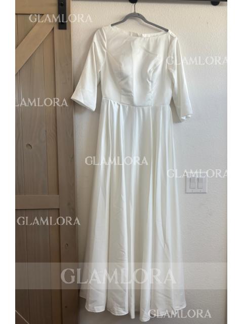 A-line wedding dress with a bateau neckline, 3/4 sleeves, and floor-length in other fabric.