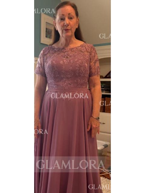 This mother of the bride dress features an A-line silhouette and a scoop neckline. It has short sleeves and is adorned with delicate appliques lace. The floor-length chiffon fabric adds an elegant and flowing touch, making it a perfect choice for a sophisticated and graceful look.