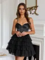 This beautiful A-line dress features delicate spaghetti straps and a sleeveless design, offering a light and airy feel. Crafted from soft tulle, the skirt is adorned with cascading ruffles that add movement and a romantic, whimsical touch. The corset-style bodice provides a structured, figure-flattering fit, creating a perfect balance between elegance and playfulness. Falling to a short or mini length, this dress is ideal for parties, weddings, or special celebrations.