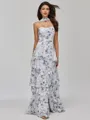 This elegant A-line dress features a straight neckline and sleeveless design, with cascading ruffles that add a touch of sophistication. The floor-length chiffon fabric flows beautifully, creating a graceful and refined silhouette.