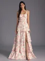 This A-line bridesmaid dress features straps and a sleeveless design, offering a timeless and elegant look. Cascading ruffles add a touch of sophistication and movement to the floor-length silhouette. Perfect for a bridesmaid who desires a chic and graceful appearance for the wedding.