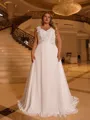 This plus size A-line wedding dress features a flattering V-neckline and sleeveless design, adorned with delicate lace appliques. The corset bodice flatters the figure, while the lightweight chiffon skirt flows into a graceful sweep train, creating a romantic and timeless bridal look.